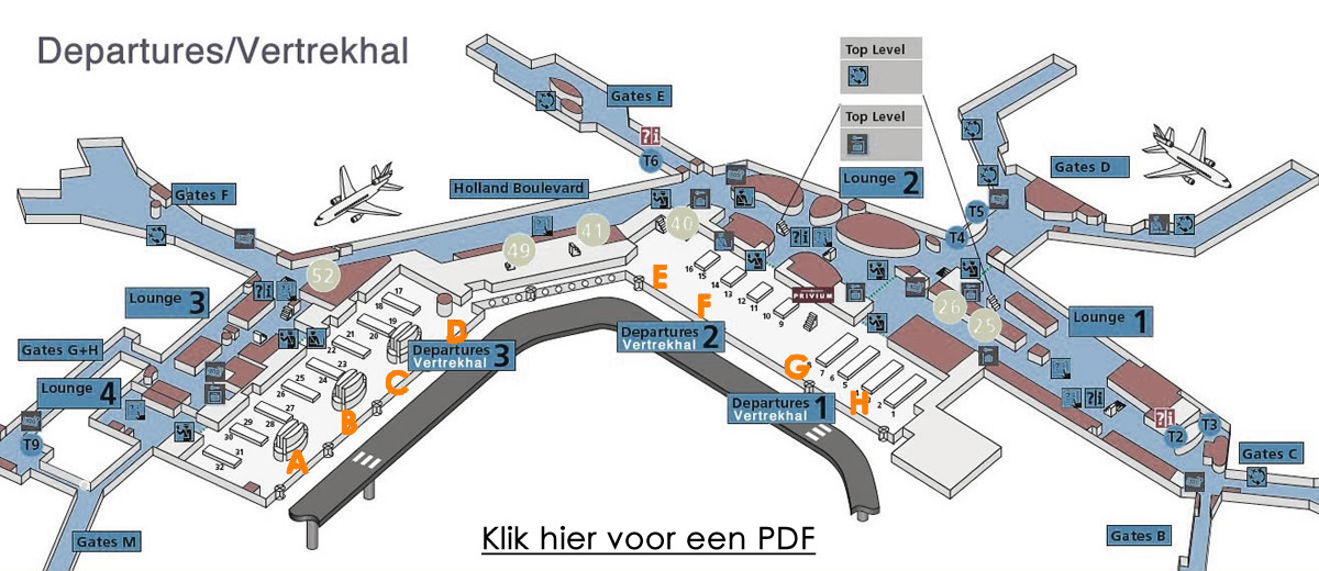 Op de plattegrond ziet u hoe u bij de Vertrekhal kan komen. Heeft u eenmaal uw koffers dan neemt u na de bagagehal direct de lift of roltrap één verdieping omhoog. U komt dan uit in de Vertrekhal. Hier neemt u de dichtstbijzijnde draaideur naar buiten en meldt u de chauffeur telefonisch bij welke deur (A-H) u staat. Vervolgens zal hij u zo snel mogelijk op de 2e rijbaan komen ophalen.